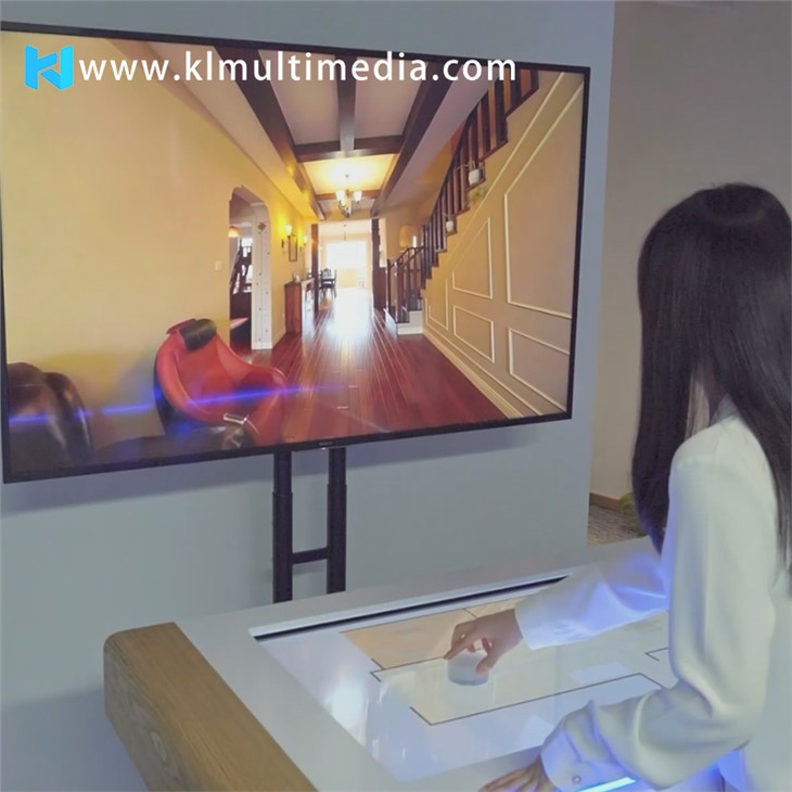 Материальный стол — один из самых популярных и применяемых продуктов в области интерактивных дисплеев и выставок. В Tangible 3D Tabletops используется универсальное устройство, которое сочетает в себе технологию физического распознавания с панорамным роумингом VR. Манипулируя сенсорным модулем на столе физического распознавания, когда модуль расположен над музеем, панорамная карта VR соответствующего местоположения музея отображается на большом экране. Управляя сенсорным модулем, музей можно посещать с панорамным видом, что является новым опытом VR-роуминга. Он широко используется для интерактивных дисплеев и выставок.
